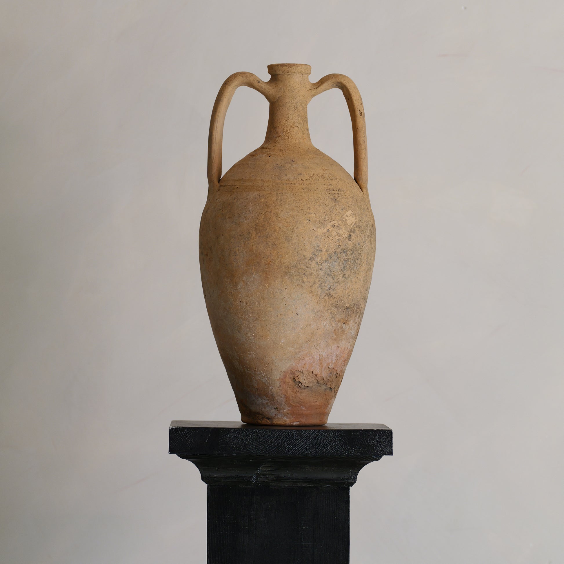Recipiente tradicional de barro cocido, de forma estilizada y asas superiores integradas.