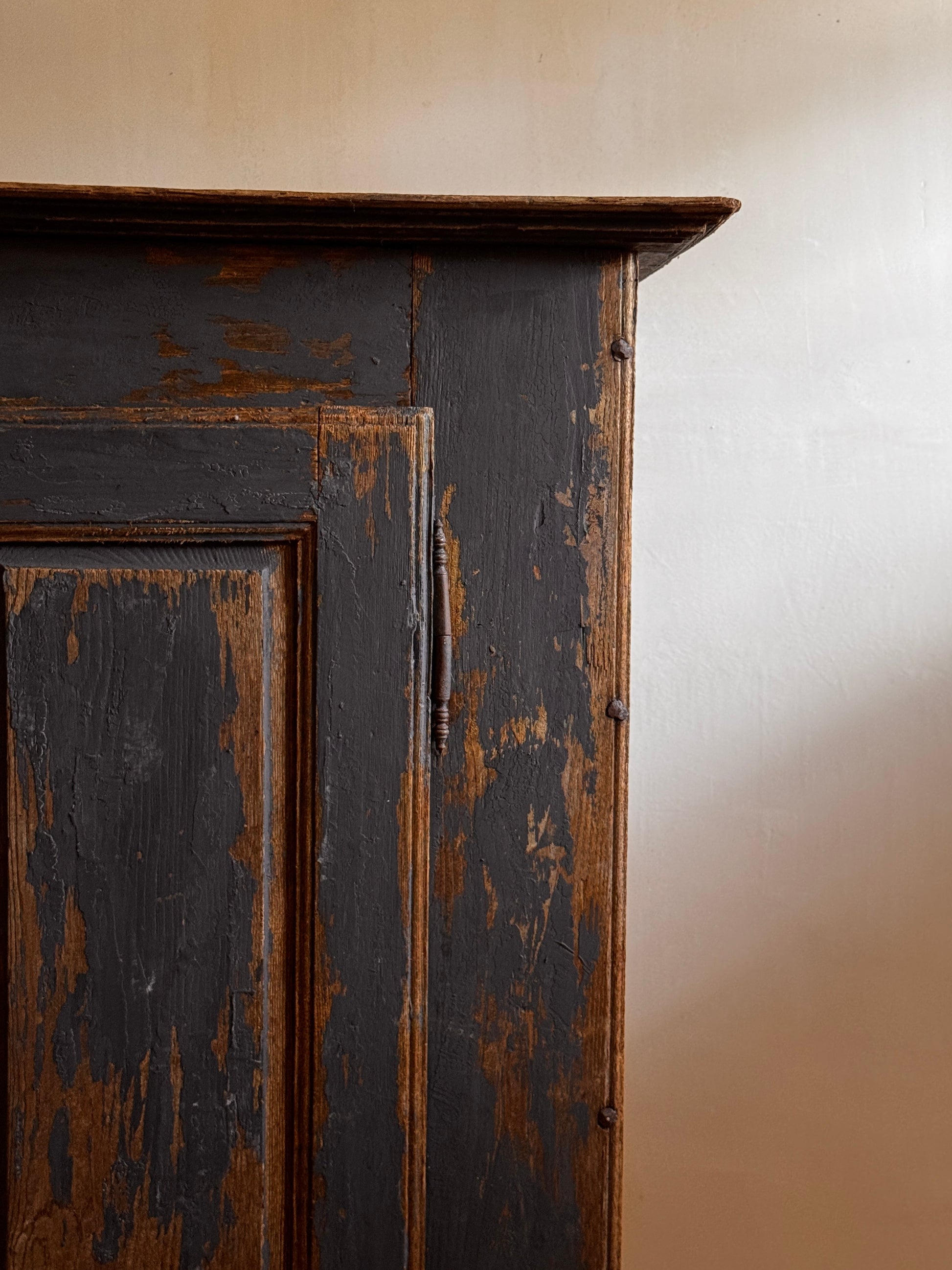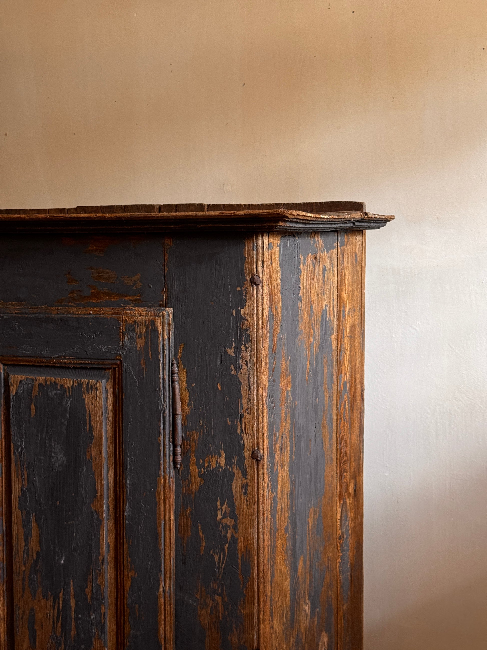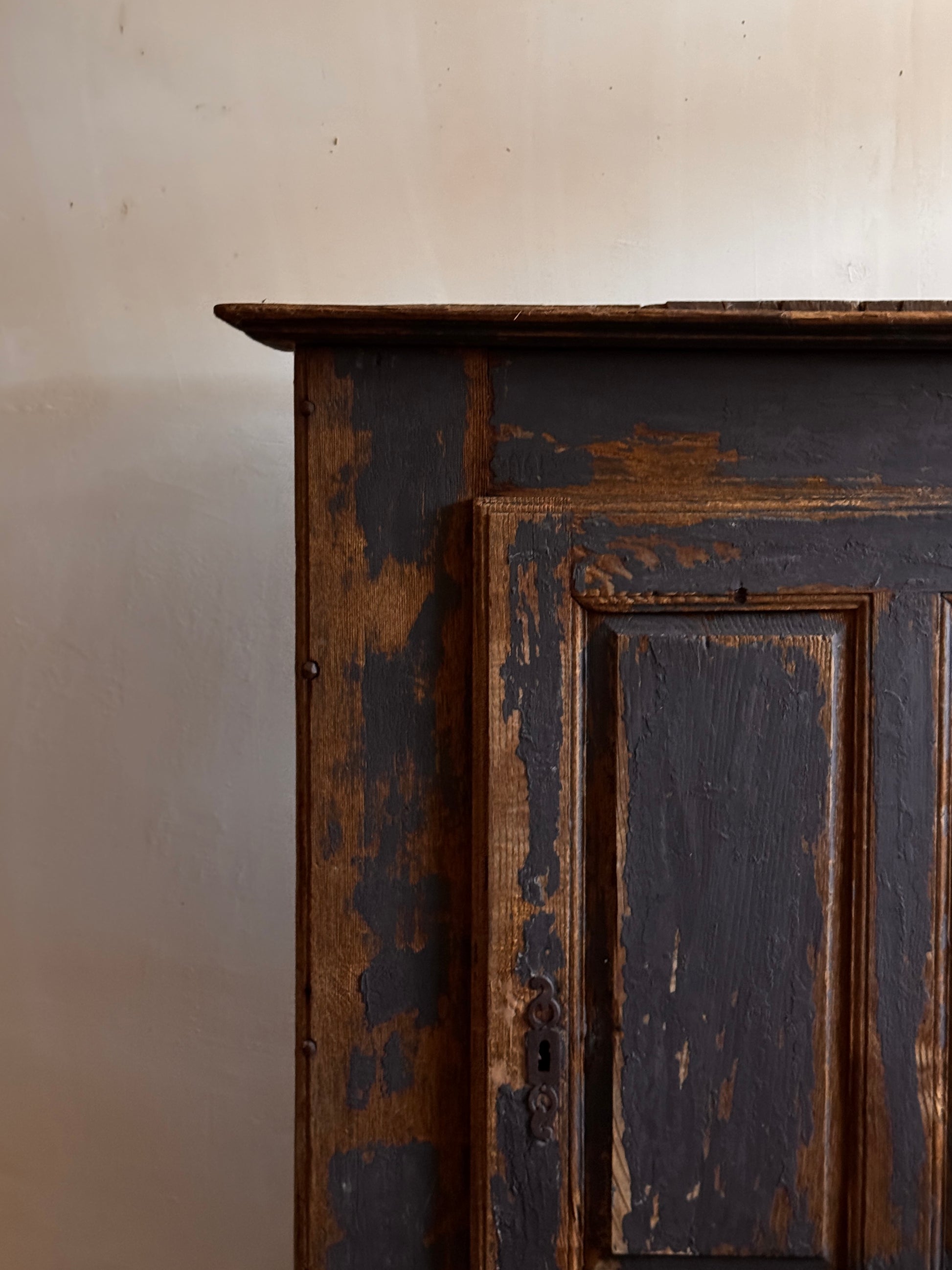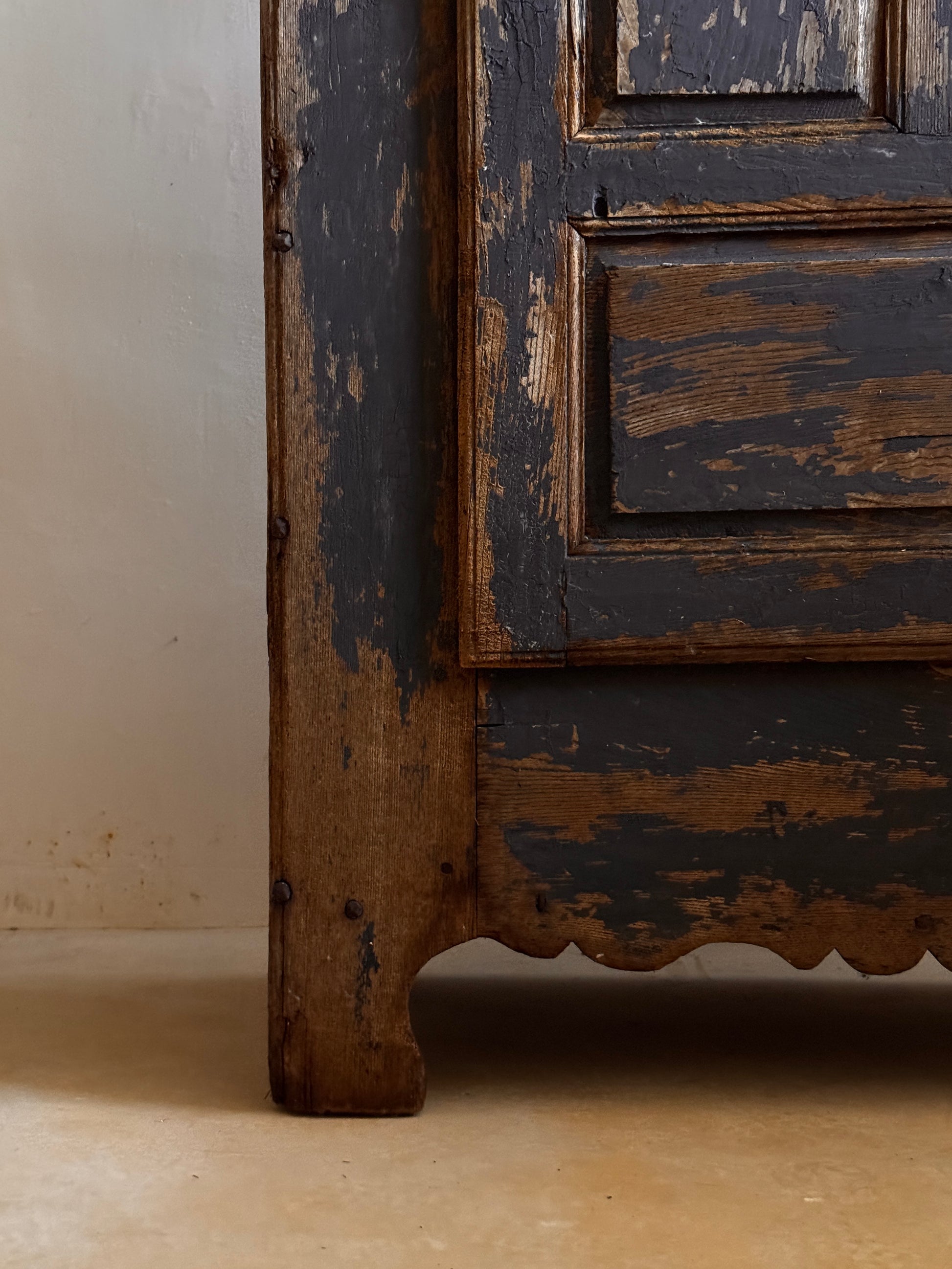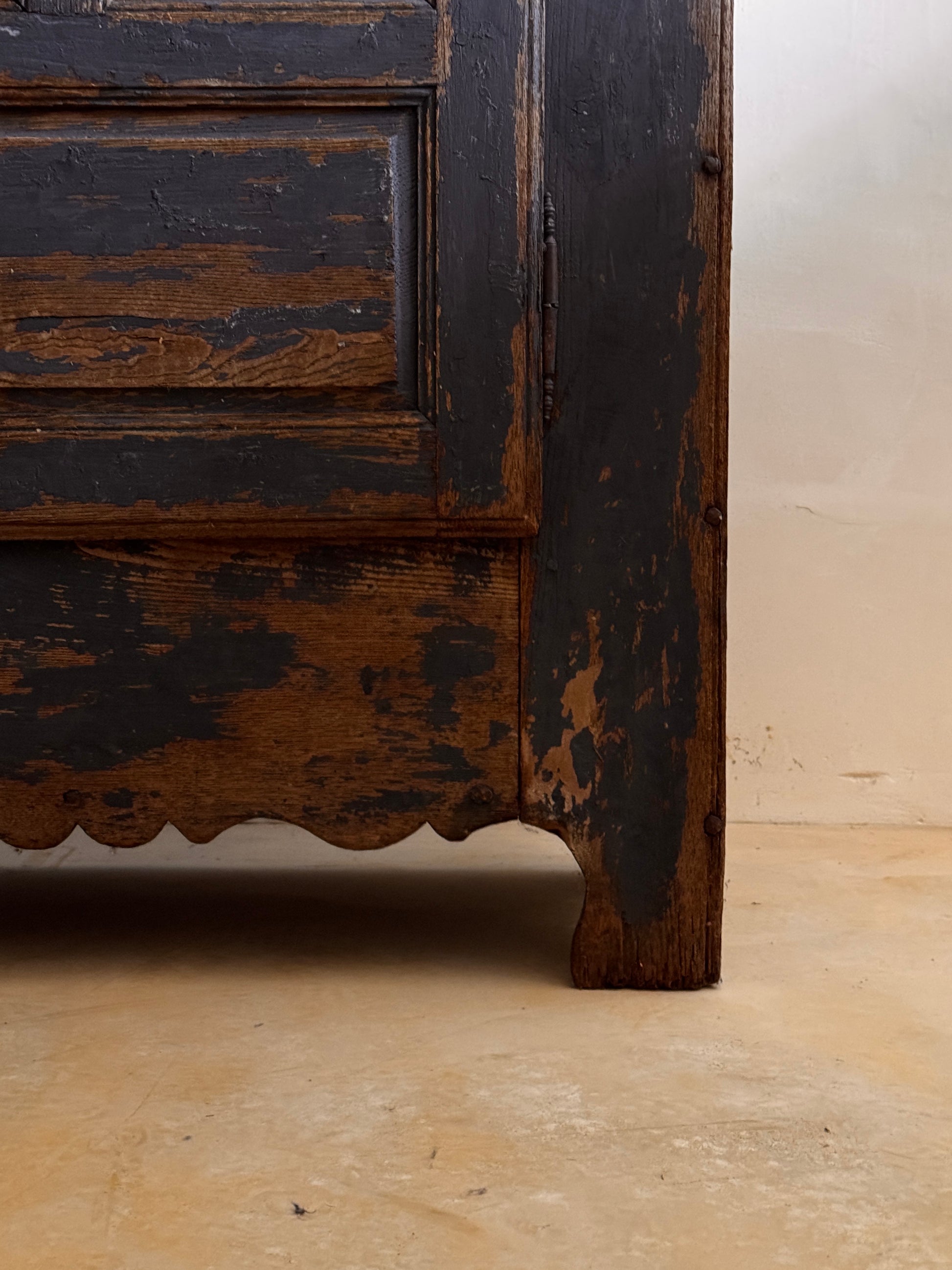Imponente armario barroco del siglo XVIII, realizado en roble macizo con una hermosa pátina natural que resalta la nobleza de la madera. Procedente de Europa Central, esta pieza combina fuerza arquitectónica y elegancia rústica.