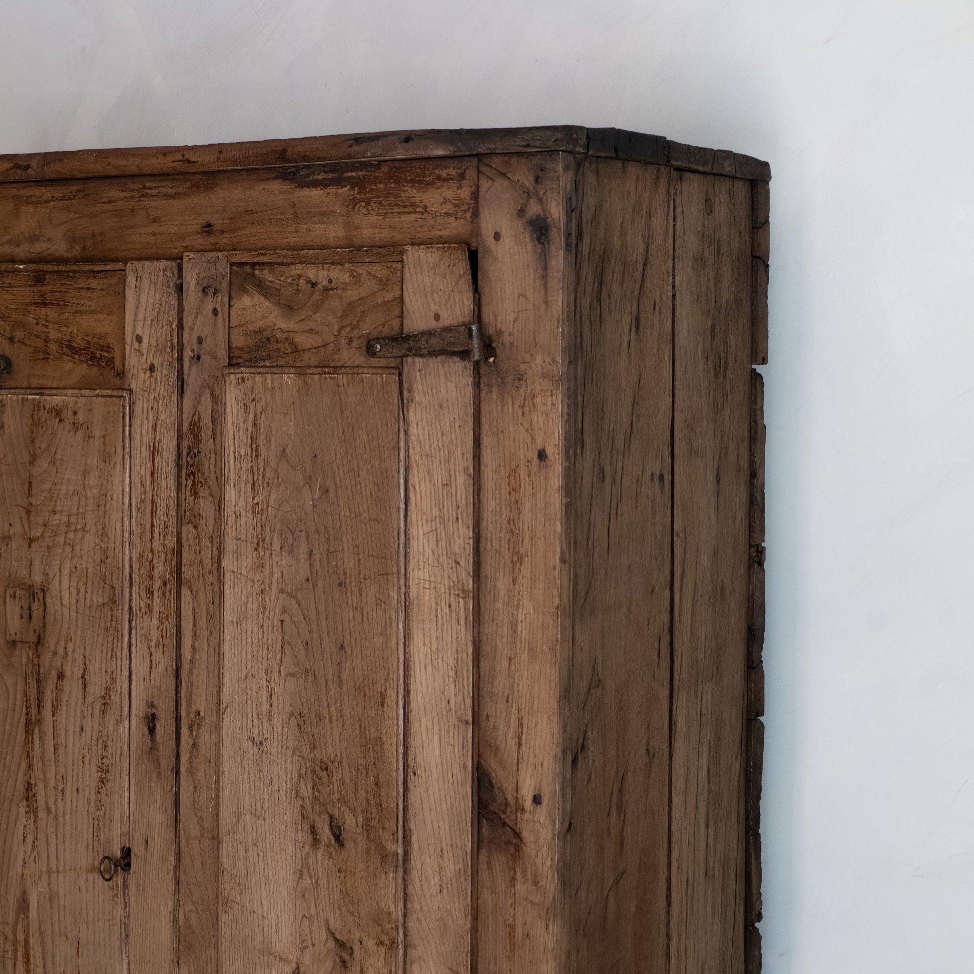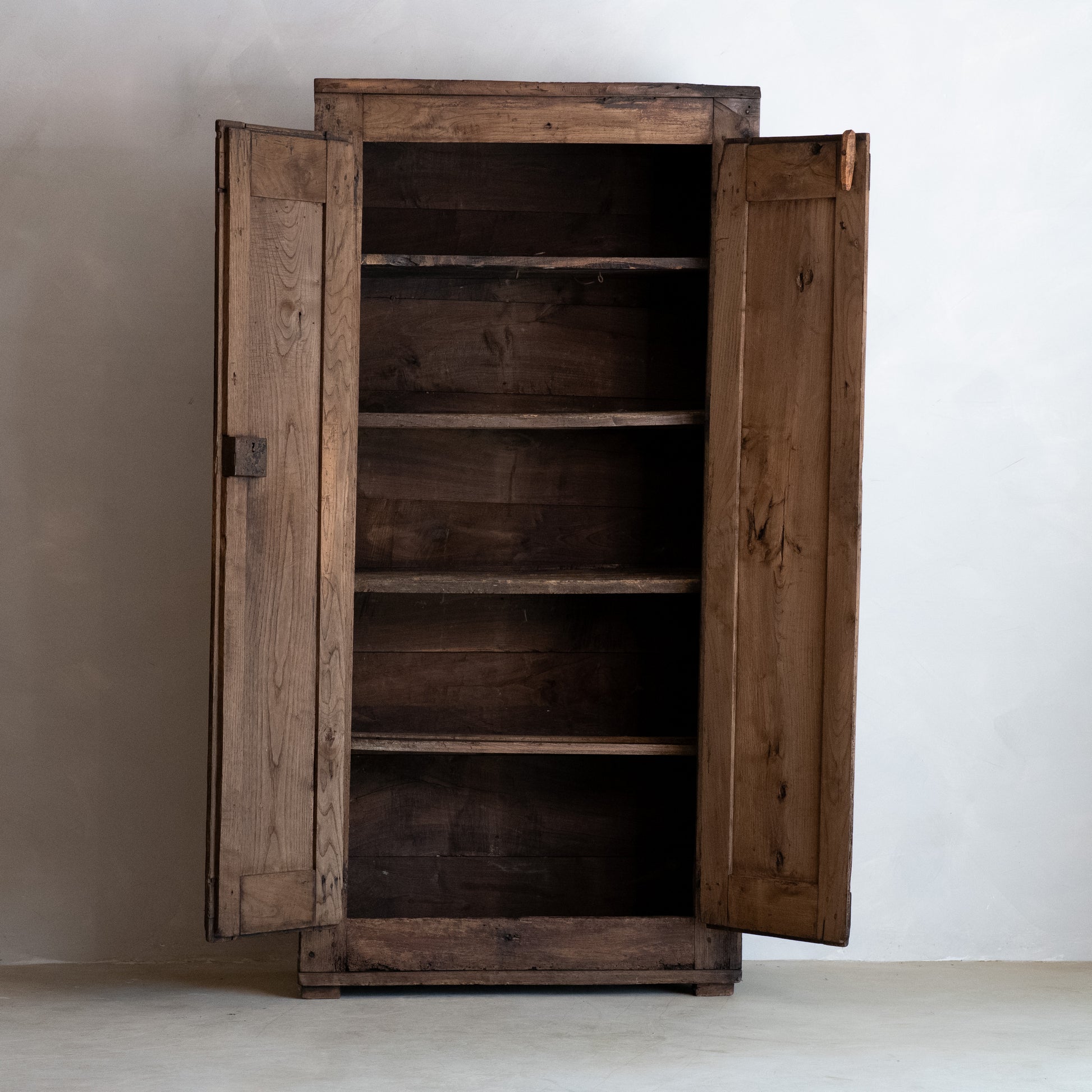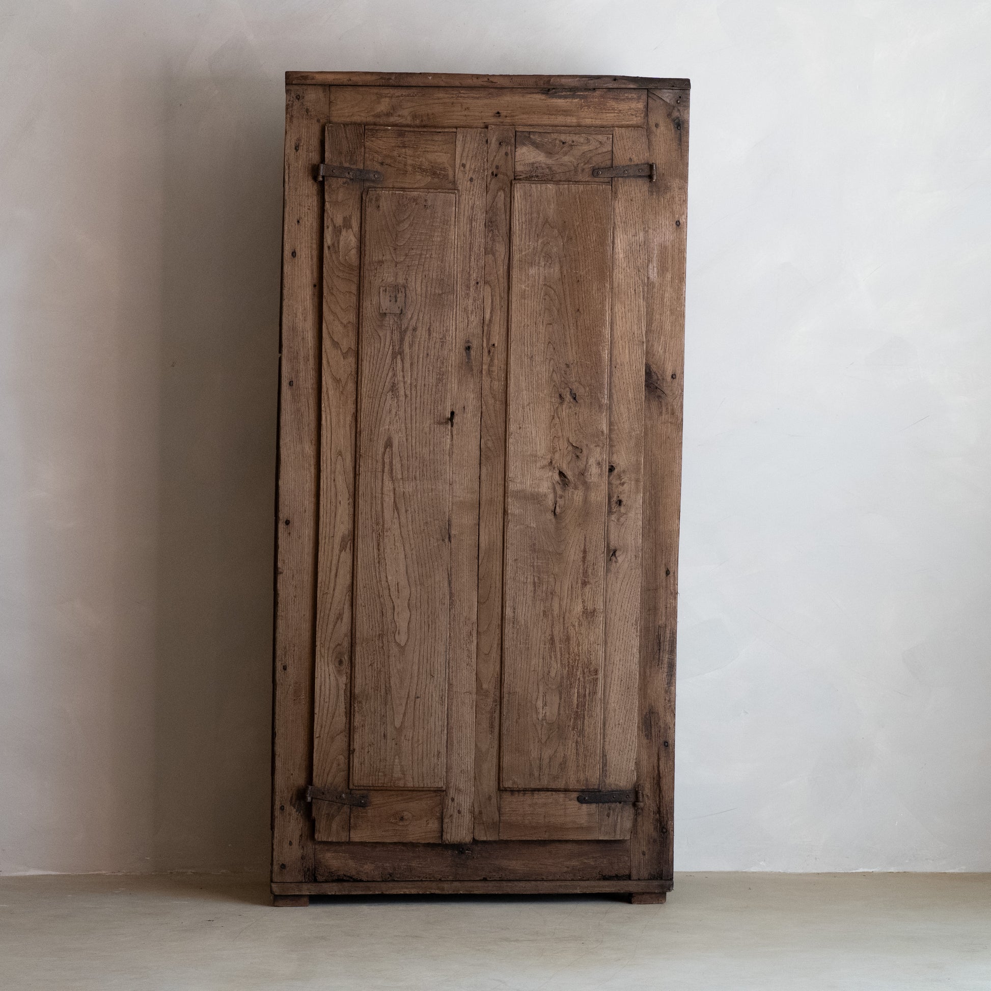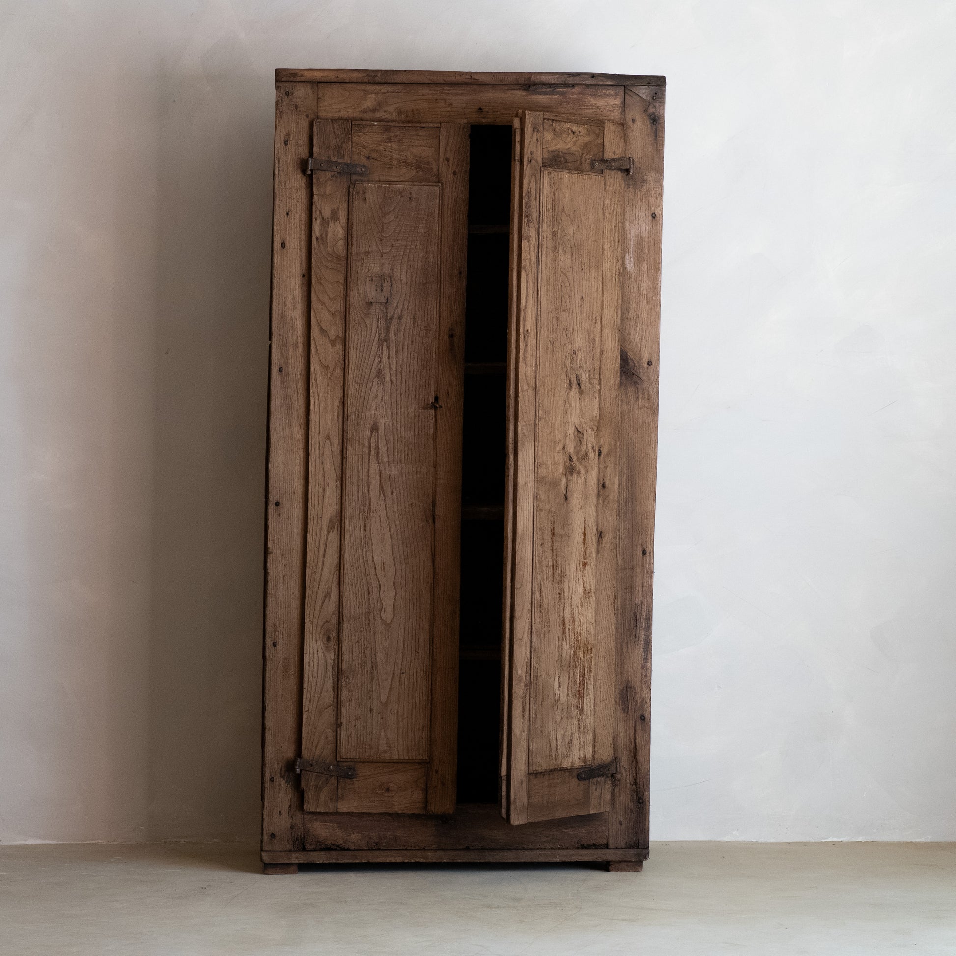Un armario de dos puertas de roble macizo, de estilo rústico. El frontal, de diseño sencillo, consta de amplios paneles verticales enmarcados por gruesos montantes. Las puertas se montan sobre bisagras de hierro forjado. El interior cuenta con cuatro baldas fijas que ofrecen un amplio espacio de almacenamiento.