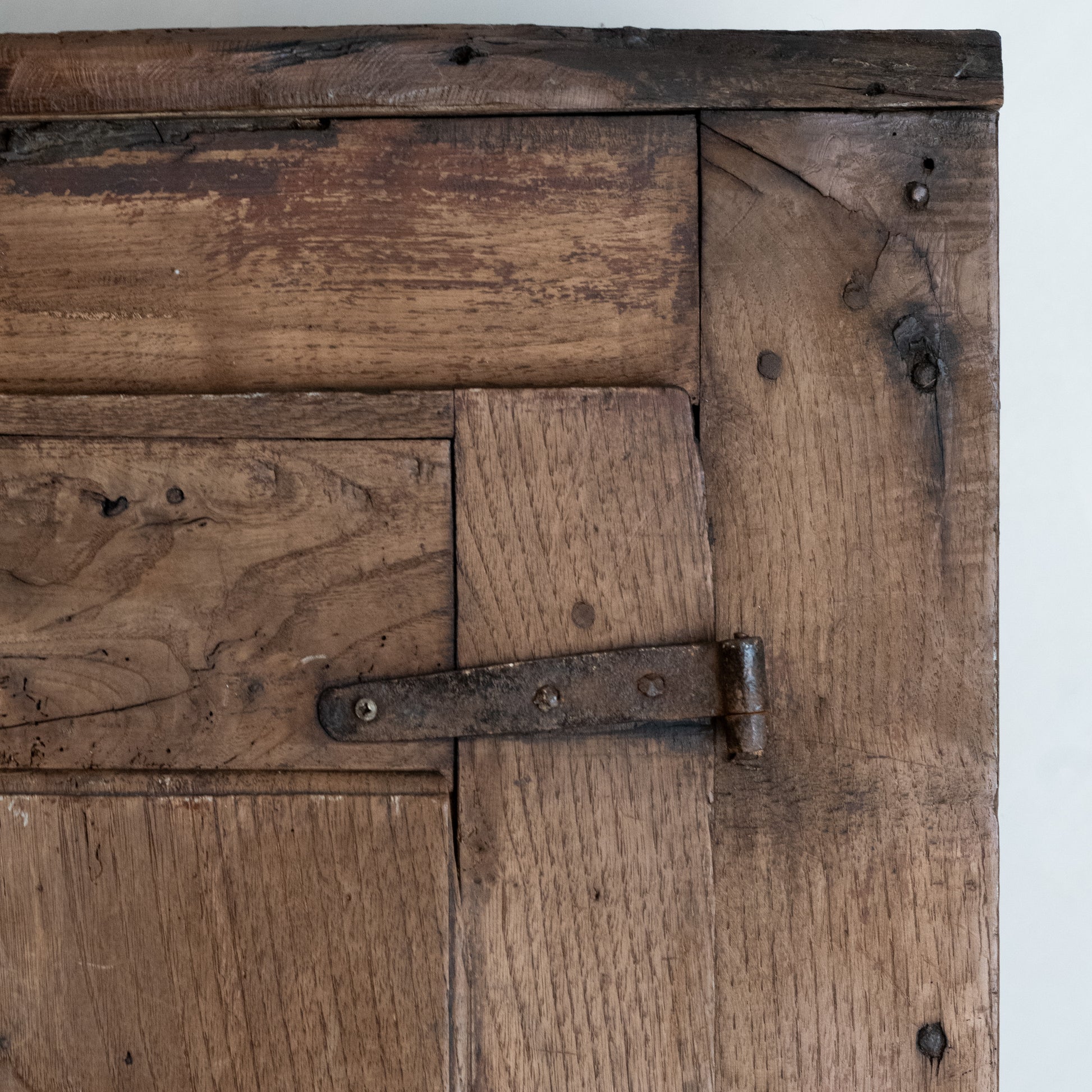 La madera presenta una veta pronunciada y una hermosa pátina, con rastros de uso e irregularidades propias de la antigüedad y el carácter rural de la pieza.