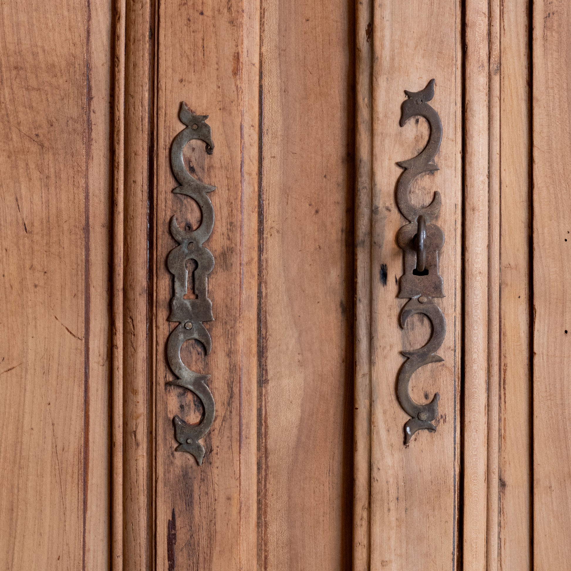 Armario antiguo de madera clara, de líneas elegantes y sobrias, con puertas paneladas y patas suavemente curvadas.