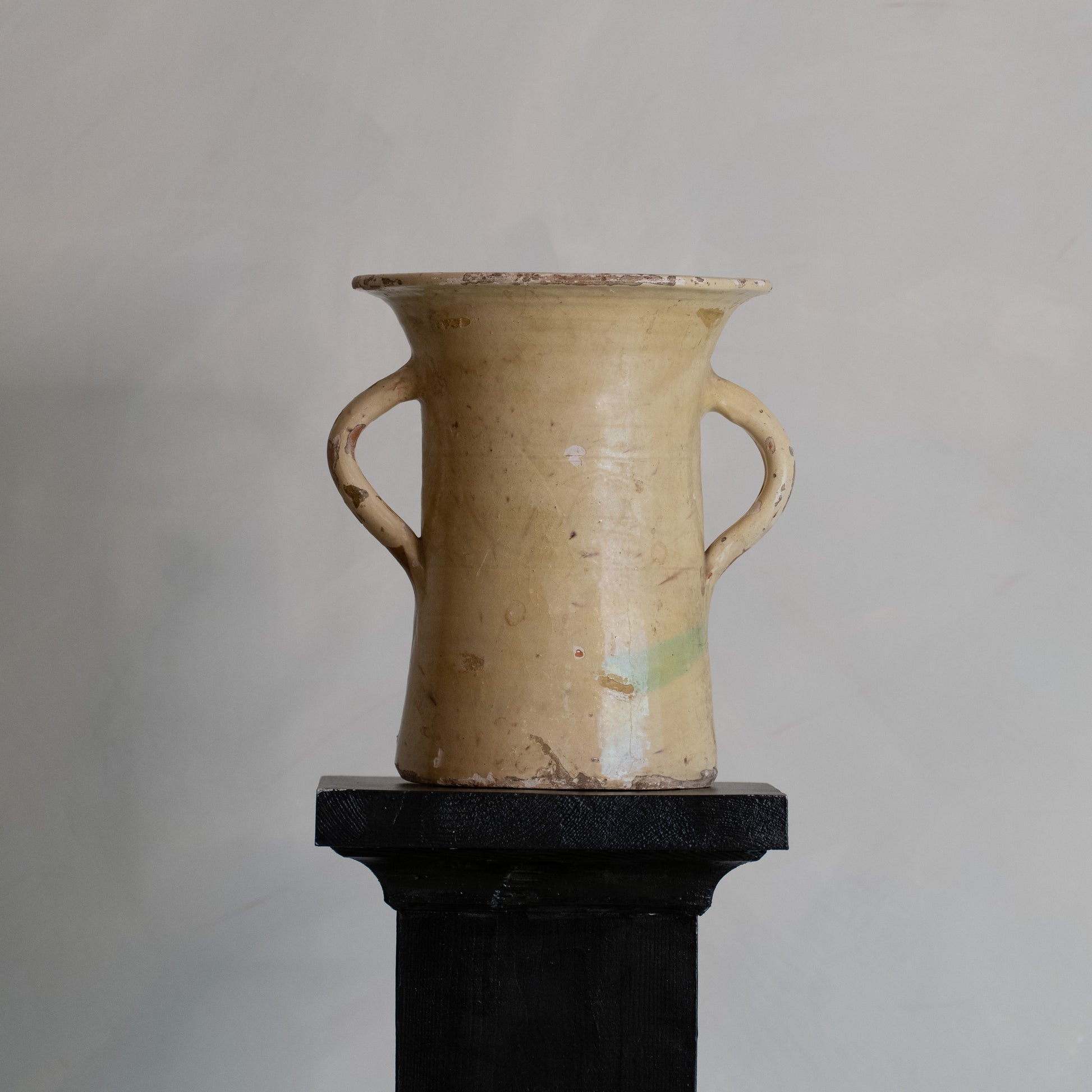 Recipiente doméstico de cerámica vidriada en tono claro, con asas laterales y borde exvasado.