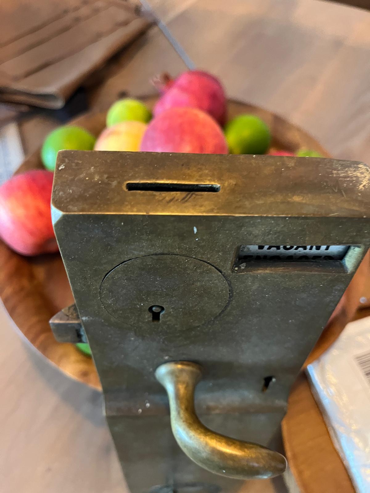 Cerradura para inodoro con monedas Parker Winder & Achurch. Cerradura de latón macizo para inodoro con pago, fabricada por Parker Winder & Achurch. Funciona correctamente con una moneda de veinticinco centavos. Sin monedas, la manija gira, pero no retrae el pestillo. Al introducir una moneda, la manija retrae el pestillo. Al abrir la puerta, una vez que el pestillo se cierra, la moneda cae completamente a través del mecanismo.