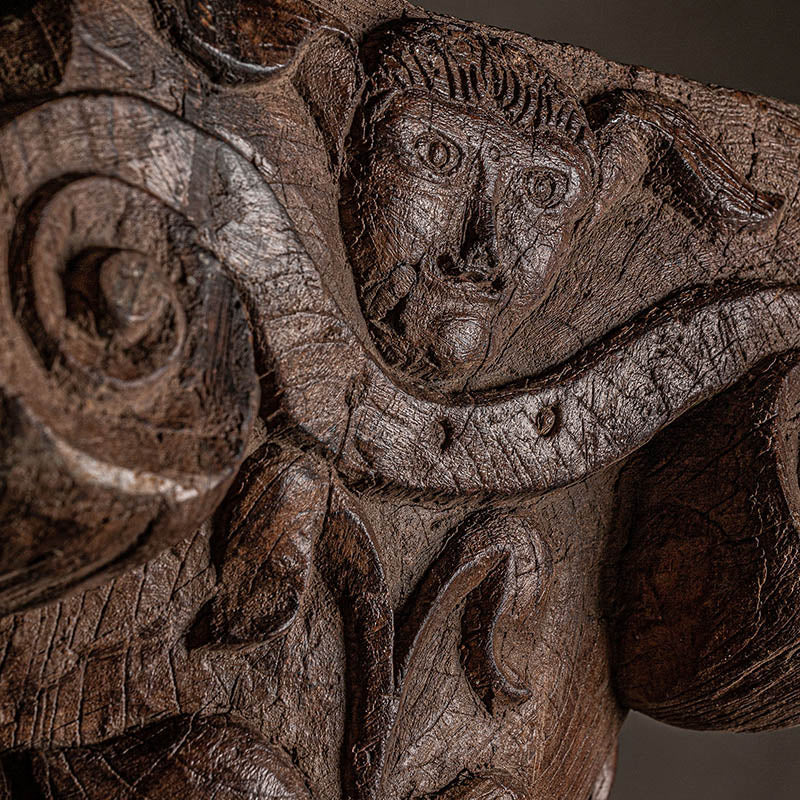 Columna Achach fabricado en madera de teka en color marrón con acabado envejecido. Pie de piedra.