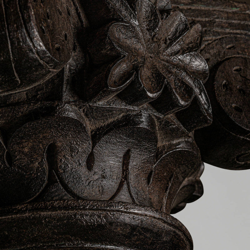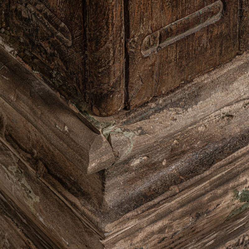 Columna Olinda fabricada en madera de teka en color marrón con acabado envejecido y con pie de piedra.