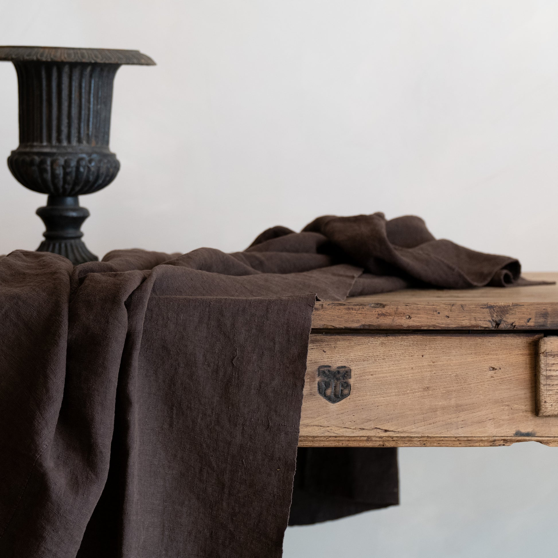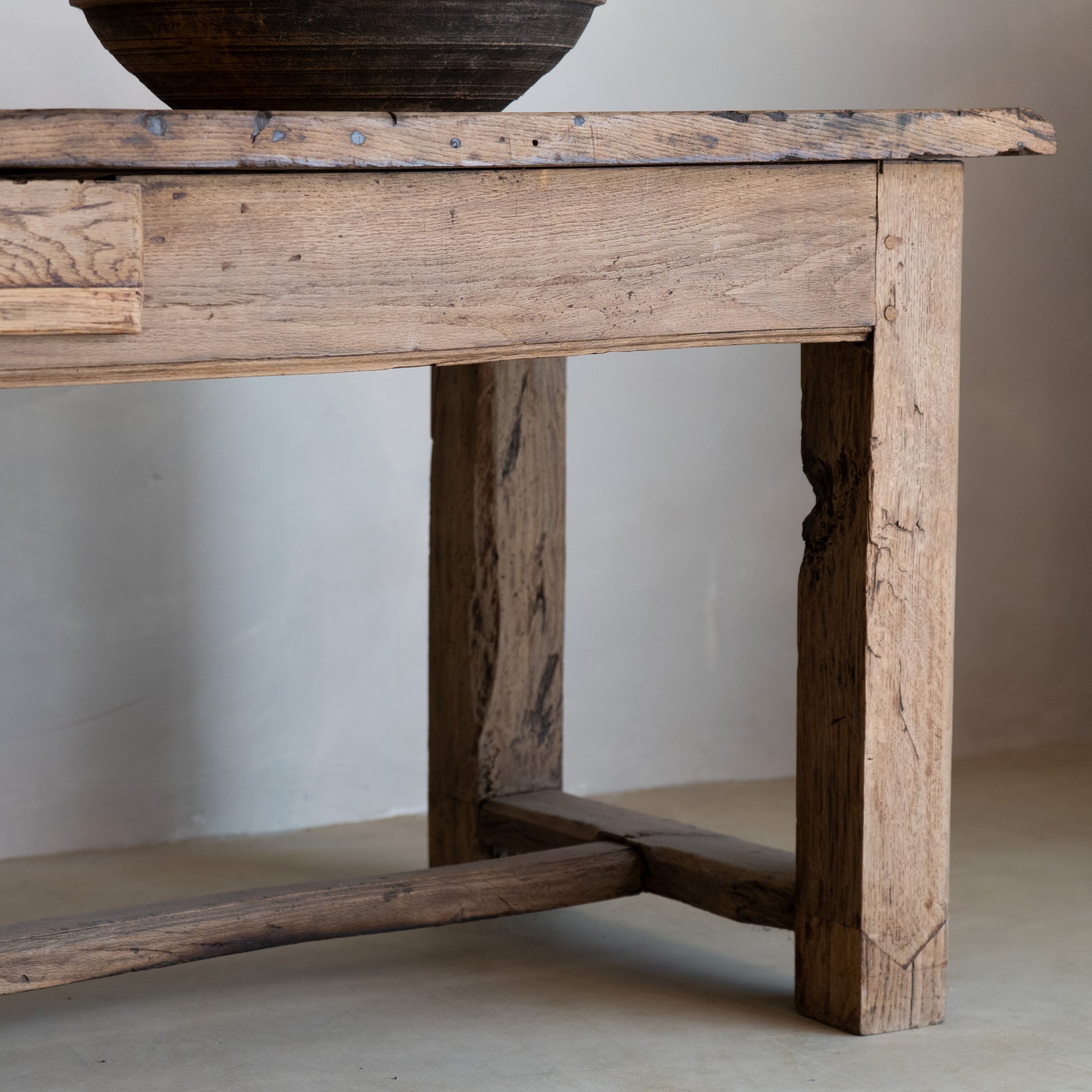 Tiene un cajón central y patas robustas unidas por un travesaño inferior, de aspecto sólido y sencillo.