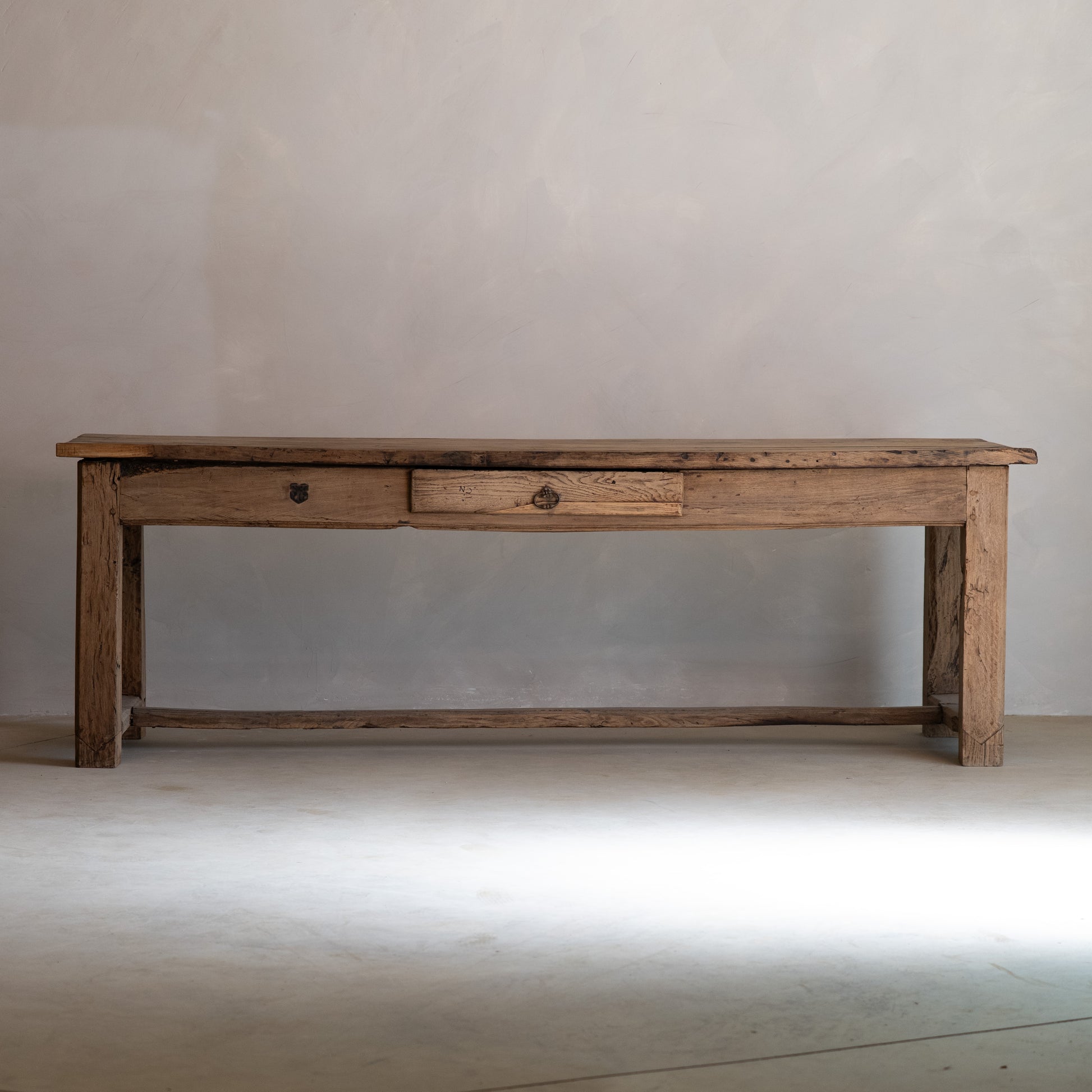Mesa de madera maciza, larga y rectangular, con acabado rústico y vetas visibles que muestran el paso del tiempo.