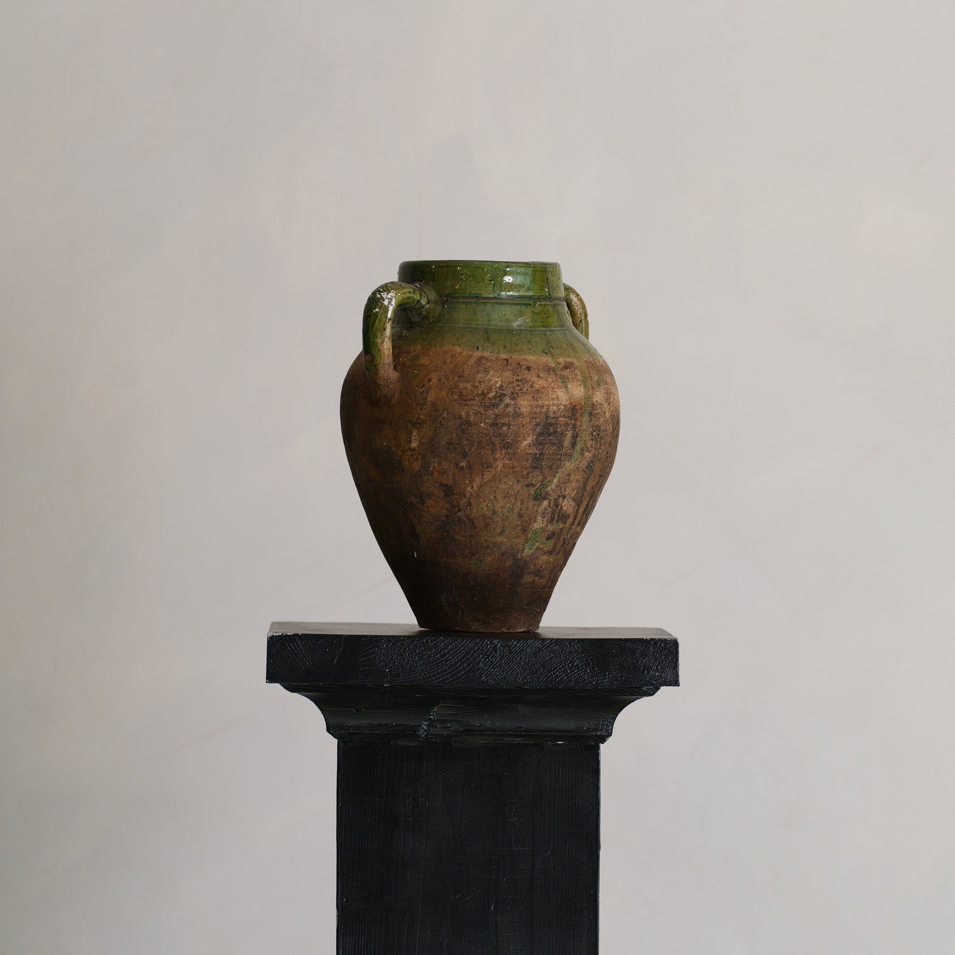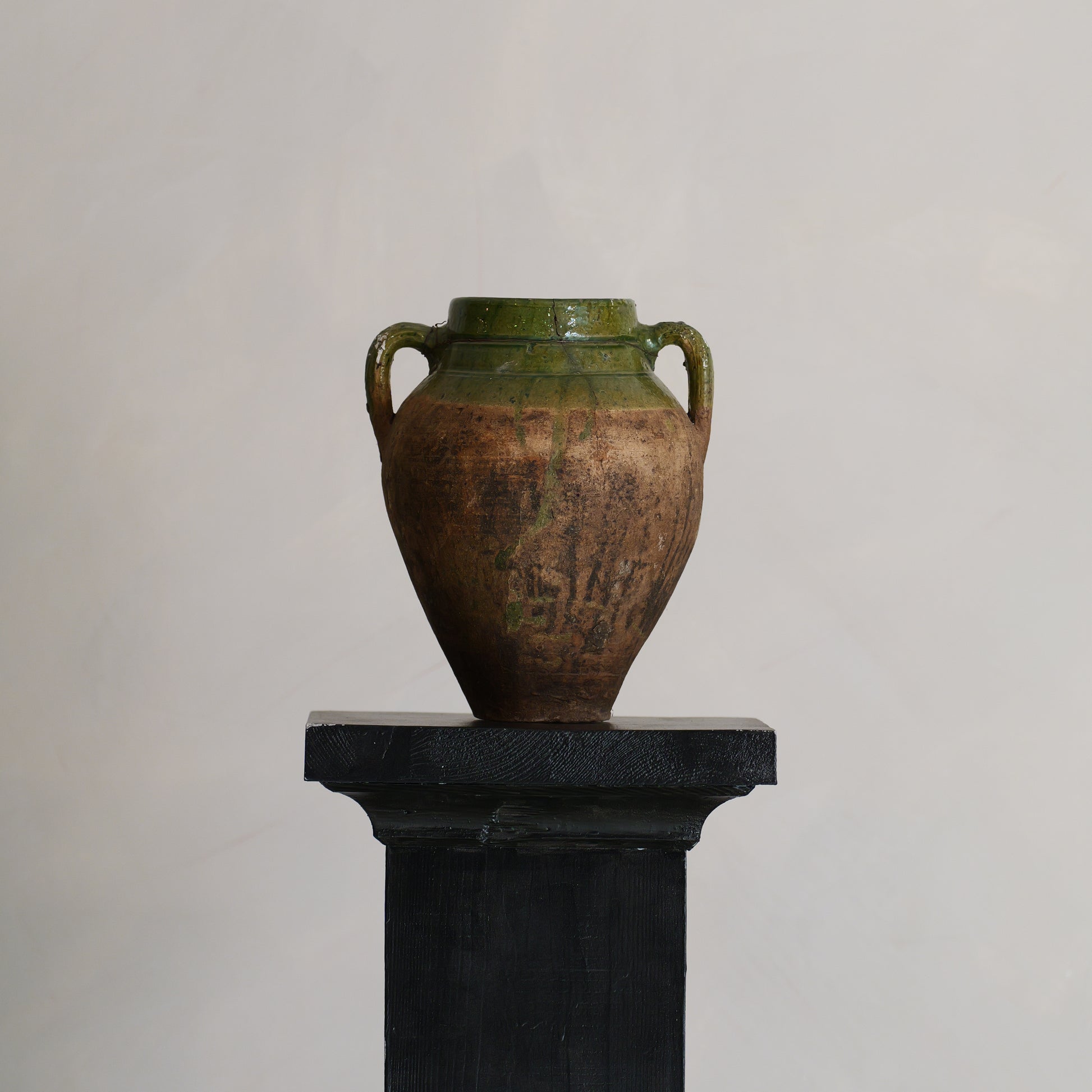 Recipiente tradicional de barro cocido con acabado oscuro y asas laterales.