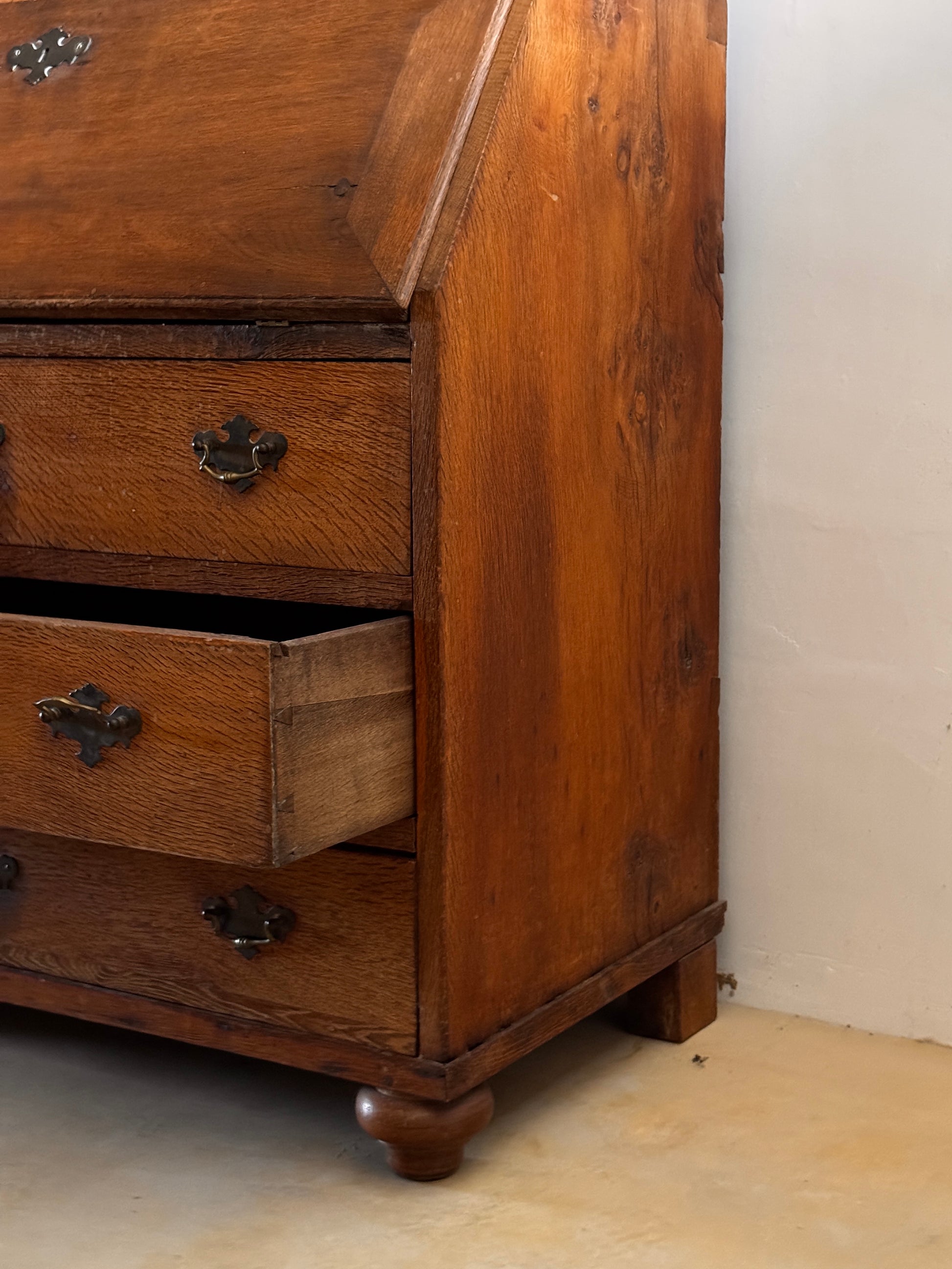 Elegante mueble del norte de Alemania, elaborado en noble madera maciza, donde la calidez de su veta natural y su delicado acabado realzan cualquier ambiente. Su vitrina superior acristalada resguarda y exhibe con encanto libros u objetos preciados, mientras que el escritorio abatible invita a momentos de escritura y contemplación. Los tres cajones inferiores, adornados con herrajes ornamentales, ofrecen generoso espacio de almacenamiento, combinando funcionalidad y belleza atemporal.