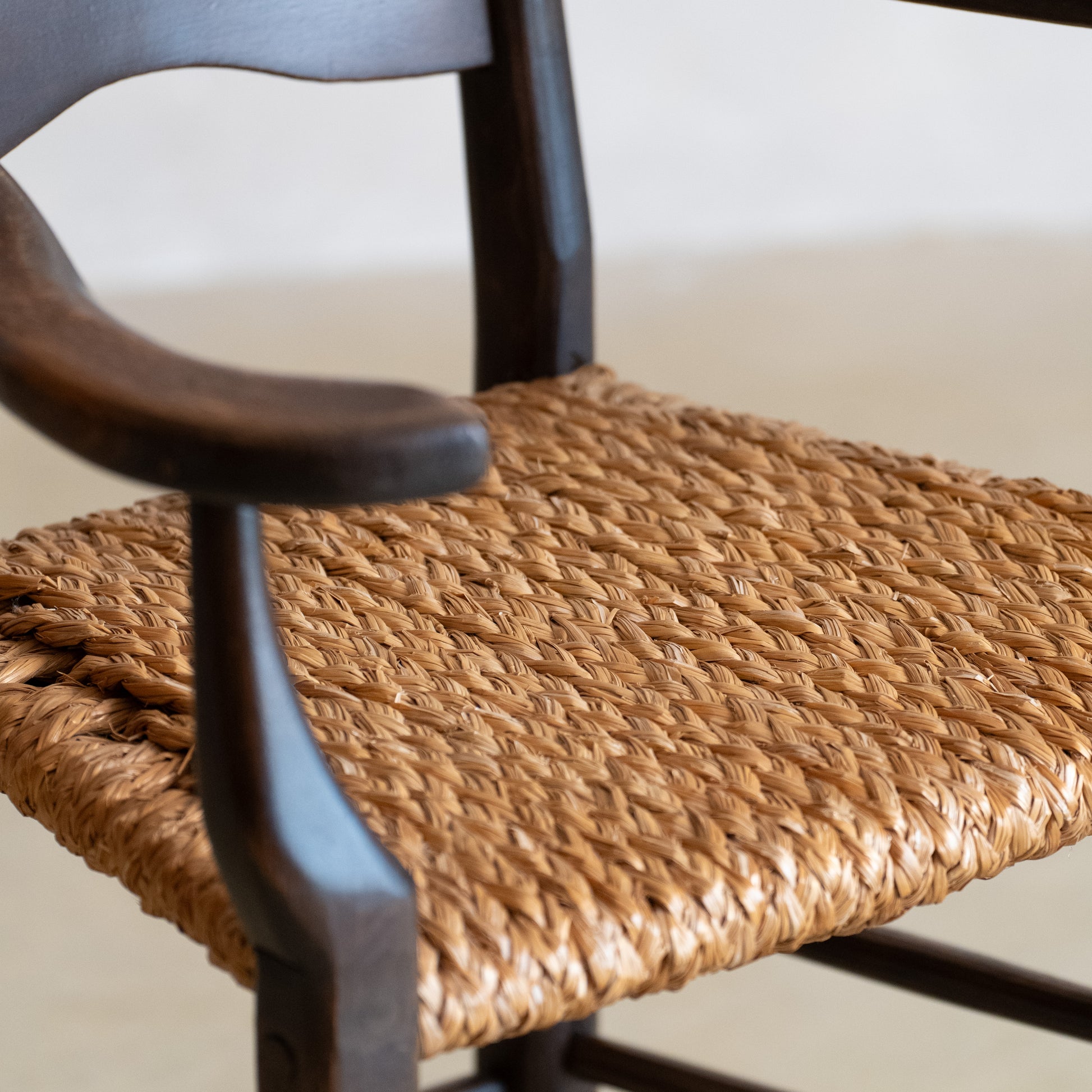Silla de respaldo escalera con brazos, fabricada en madera maciza y asiento trenzado en fibra vegetal natural.