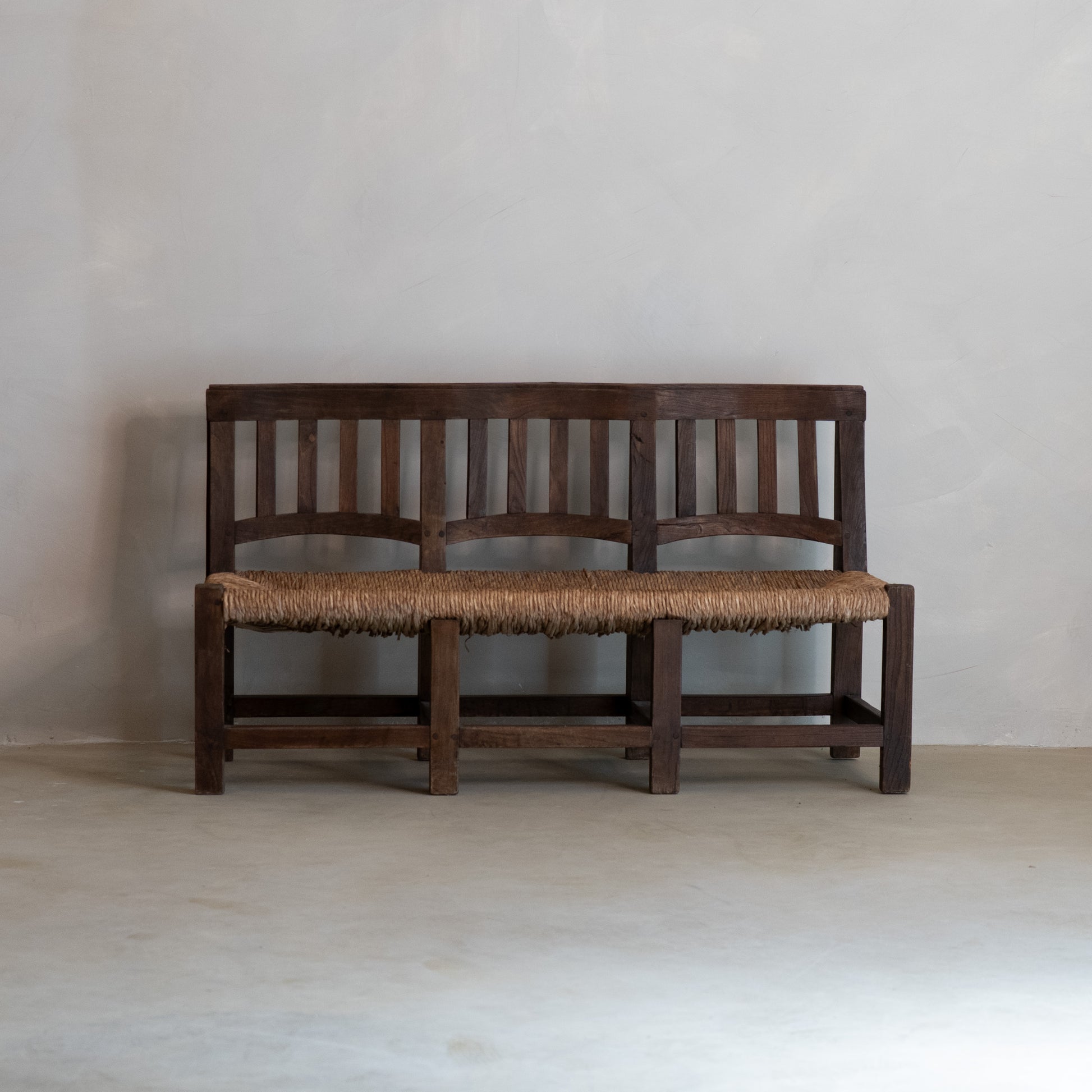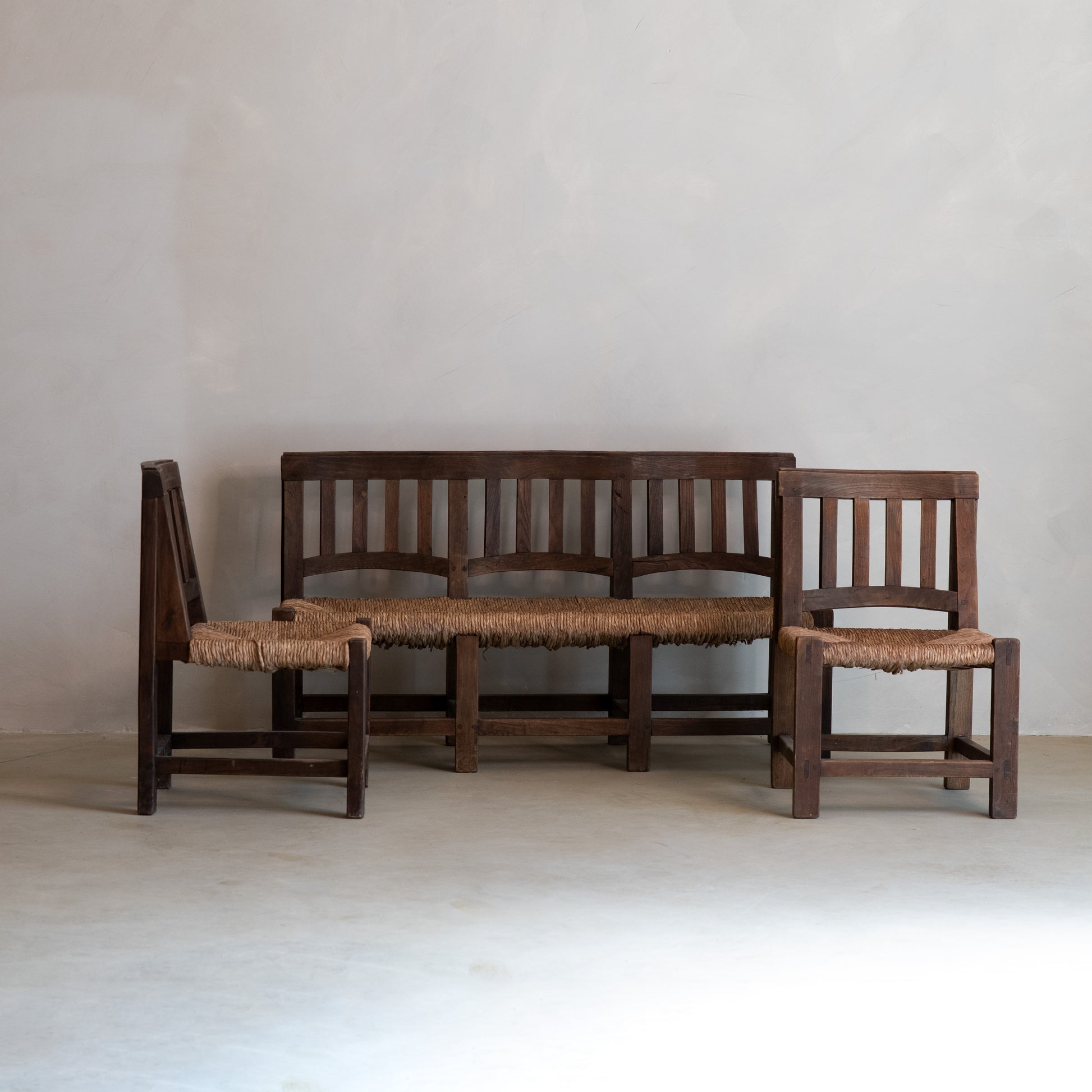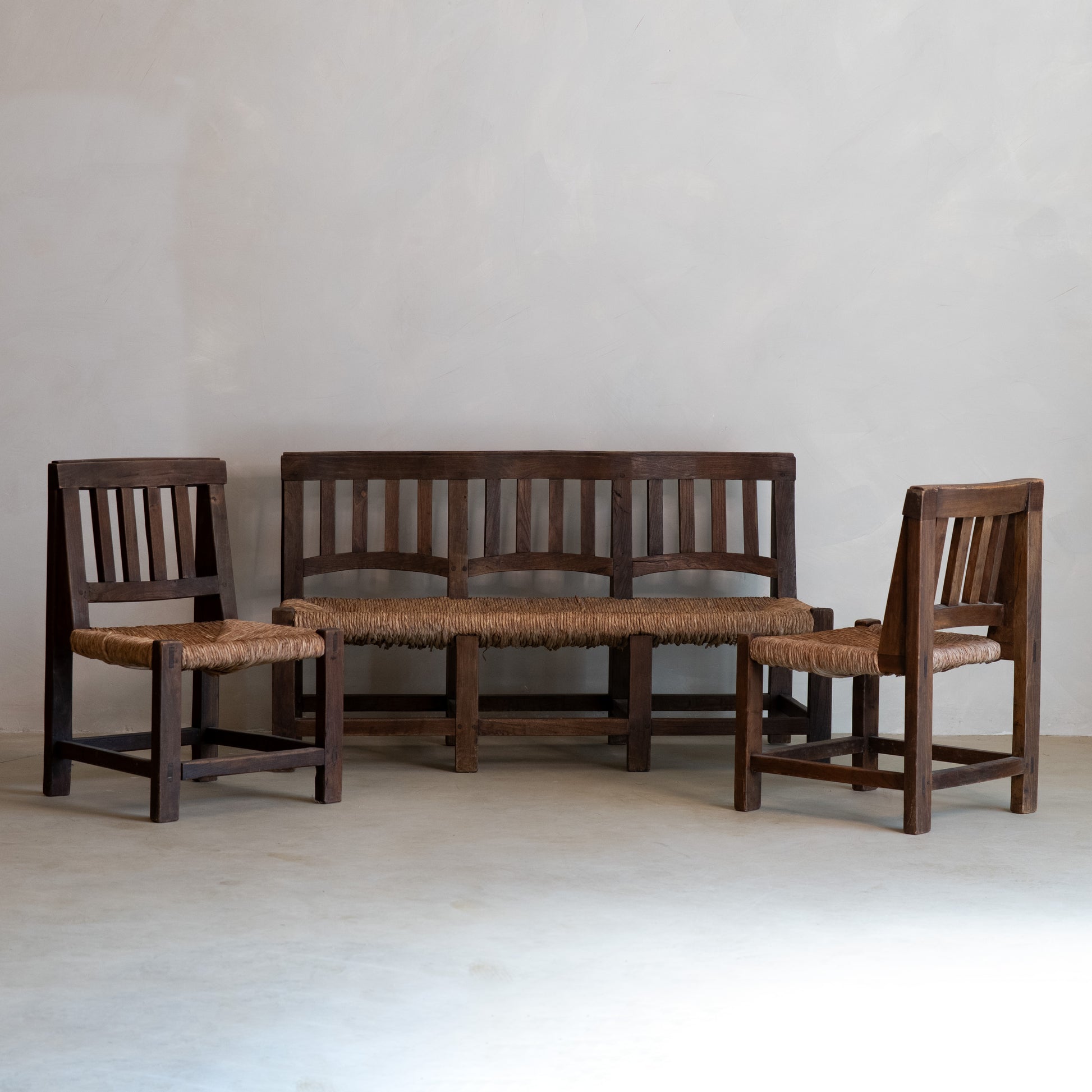 Conjunto formado por un banco y dos sillas de estilo Worpswede, de estética brutalista, fabricados en madera de pino con asientos de juncos trenzados. El diseño se caracteriza por líneas rectas, estructura robusta y una clara funcionalidad, propias del mobiliario de los años 60.