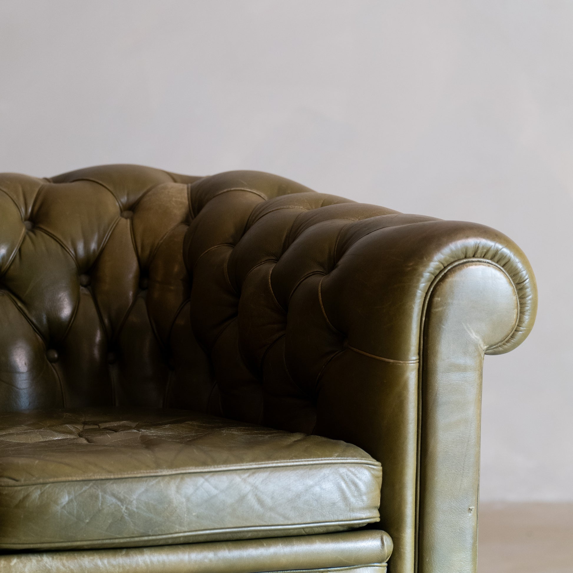 Fabricado por Arne Norell, sillón clásico de estilo inglés con capitoné profundo y brazos enrollados, tapizado en cuero verde con pátina original.